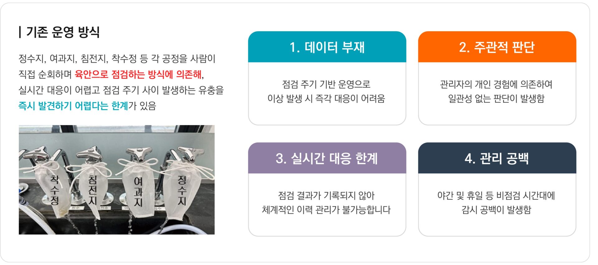육안 점검 방식의 문제 사람 중심 점검은 한계를 가질 수 밖에 없습니다.